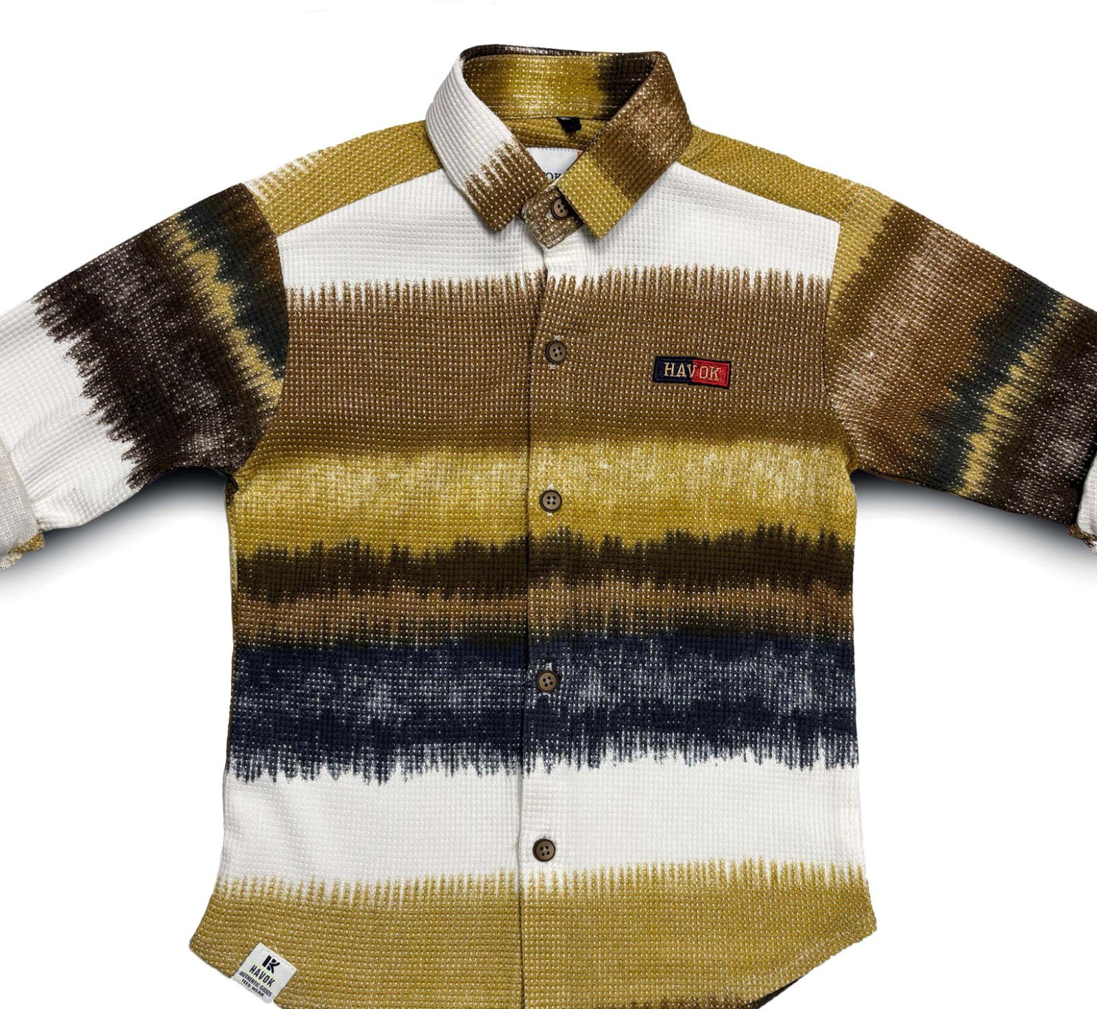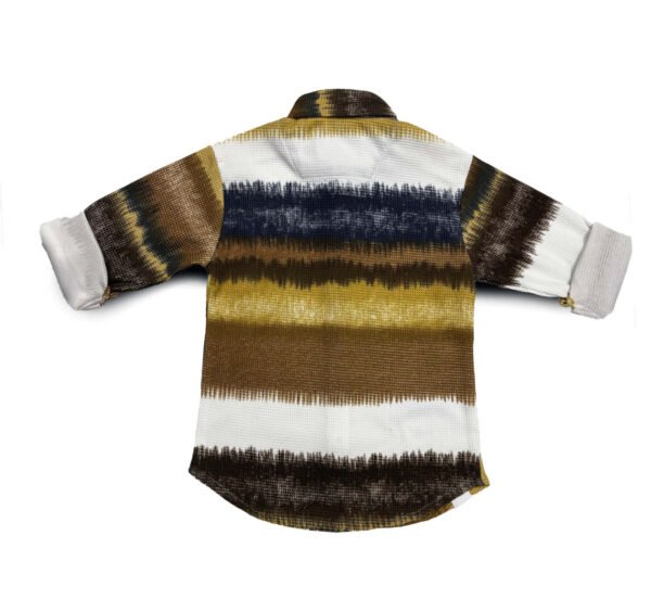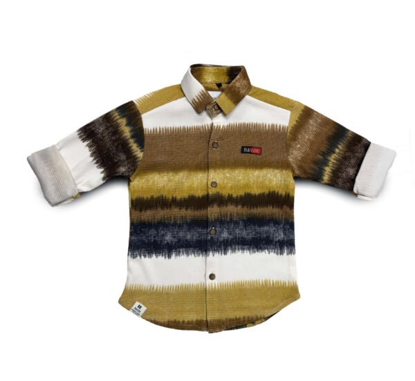 - Stylish Design: This kids shirt for boys features a trendy multicolour striped pattern with shades of mustard, brown, navy, and white.